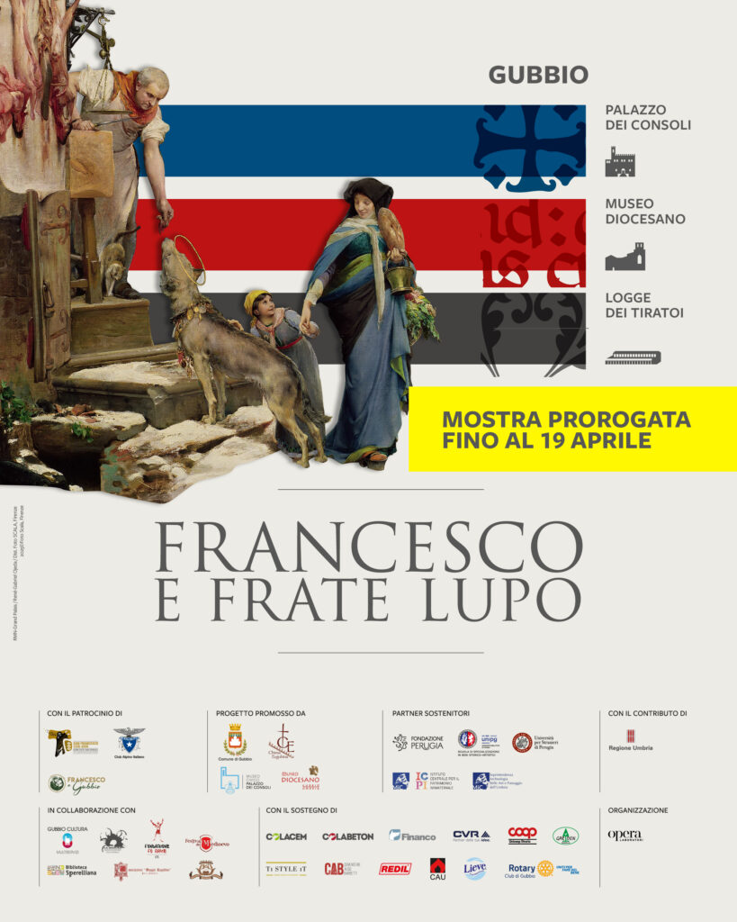 Dal 27 settembre all’11 gennaio 2026 (PROROGATA AL 19 APRILE 2026) Gubbio ospita una mostra di straordinario rilievo, dedicata a uno degli episodi più celebri e simbolici della vita di San Francesco: l’incontro con frate lupo. L’esposizione, intitolata: “Francesco e Frate Lupo. L’arte racconta la leggenda dell’incontro”, è promossa dal Comune di Gubbio, dalla Chiesa Eugubina, dal Museo Civico di Palazzo dei Consoli e dal Museo Diocesano di Gubbio, con l’organizzazione e il sostegno di Opera Laboratori. L’iniziativa gode del patrocinio del Comitato cittadino permanente “Francesco a Gubbio”, del Comitato Nazionale San Francesco 800 e del Club Alpino Italiano, e rappresenta il cuore pulsante delle celebrazioni per l’Ottavo Centenario della morte del Santo, in programma tra il luglio 2025 e il dicembre 2026.