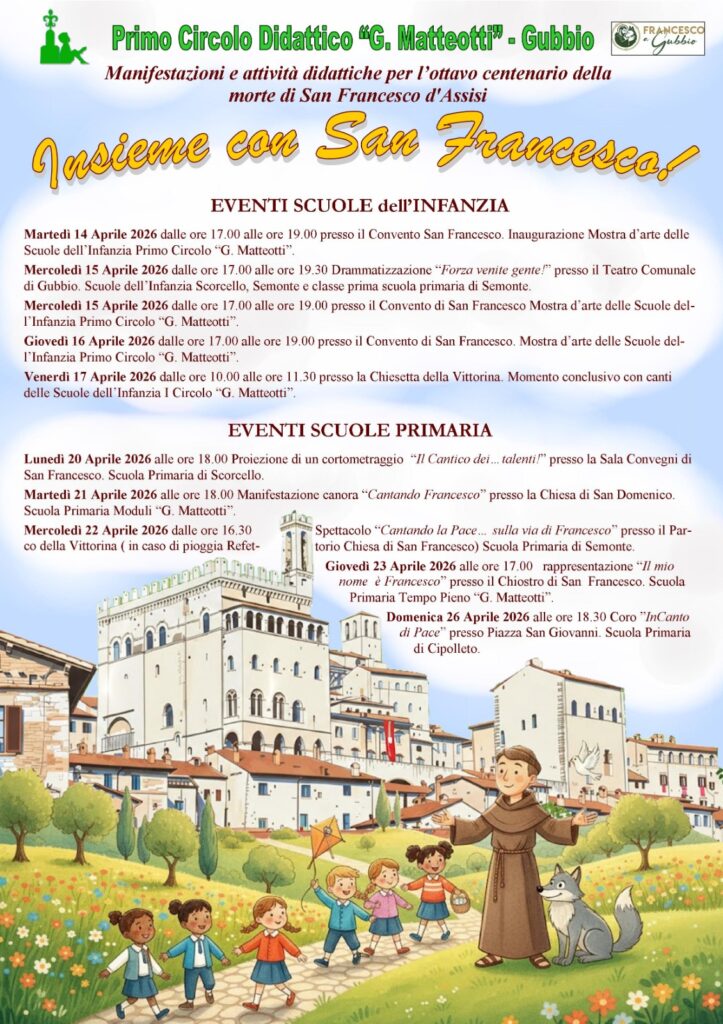 A Gubbio un ricco calendario di iniziative coinvolgerà bambini e insegnanti in occasione dell’ottavo centenario della morte di San Francesco d’Assisi. Il Primo Circolo Didattico “G. Matteotti” promuove il programma “Insieme con San Francesco!”, una serie di eventi tra arte, teatro e musica pensati per le scuole dell’infanzia e primarie.