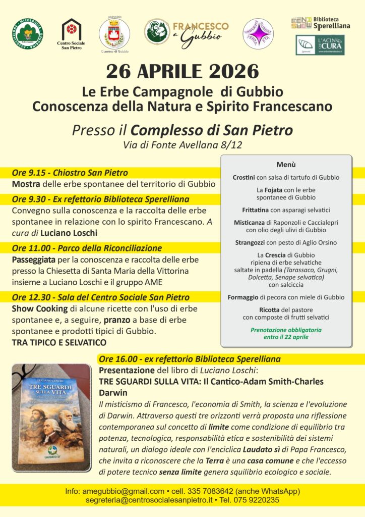 Domenica 26 aprile 2026, presso il complesso di San Pietro a GUBBIO (Via di Fonte Avellana 8/12), si terrà la giornata “LE ERBE CAMPAGNOLE DI GUBBIO. Conoscenza della Natura e Spirito Francescano”.
