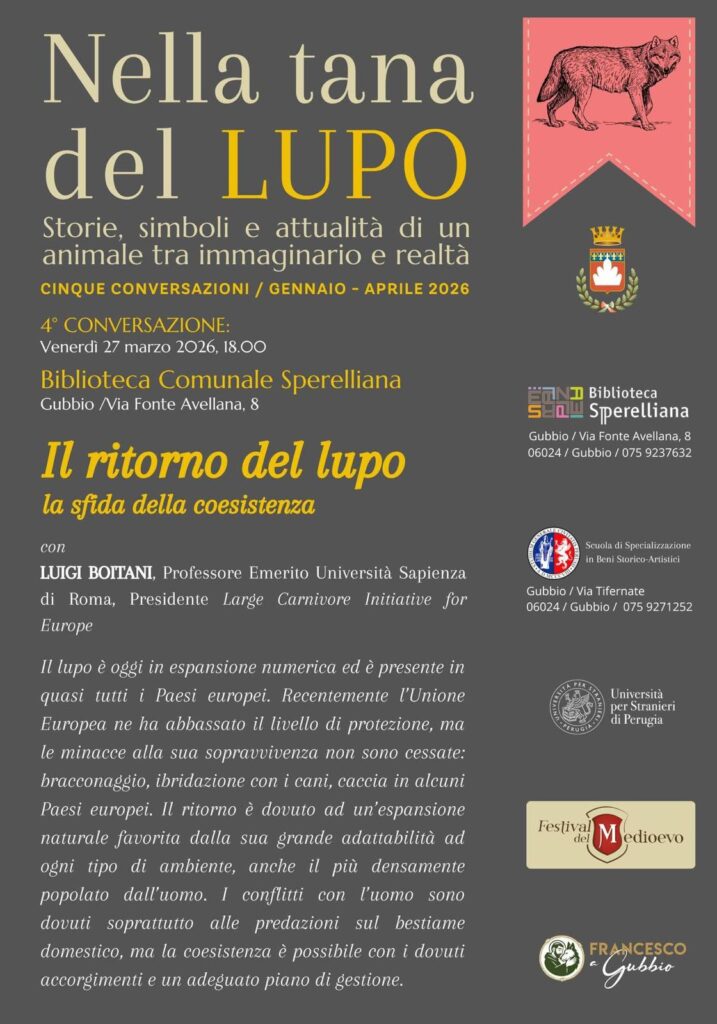Prosegue a Gubbio il ciclo di incontri “Nella tana del lupo. Storie, simboli e attualità di un animale tra immaginario e realtà”, con il quarto appuntamento in programma venerdì 27 marzo 2026 alle ore 18.