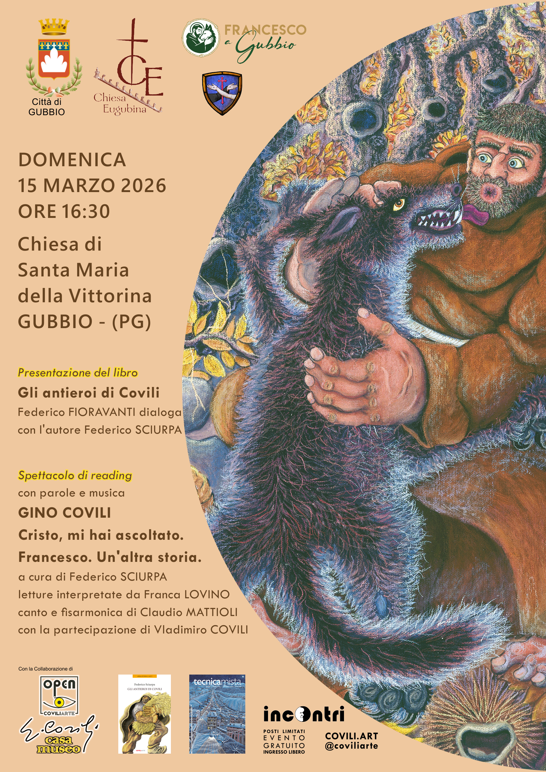 Domenica 15 marzo 2026 alle ore 16:30, presso la Chiesa di Santa Maria della Vittorina a Gubbio, si terrà la presentazione del libro Gli antieroi di Covili. Federico Fioravanti dialogherà con l’autore Federico Sciurpa in un incontro dedicato alla figura e all’opera di Gino Covili.